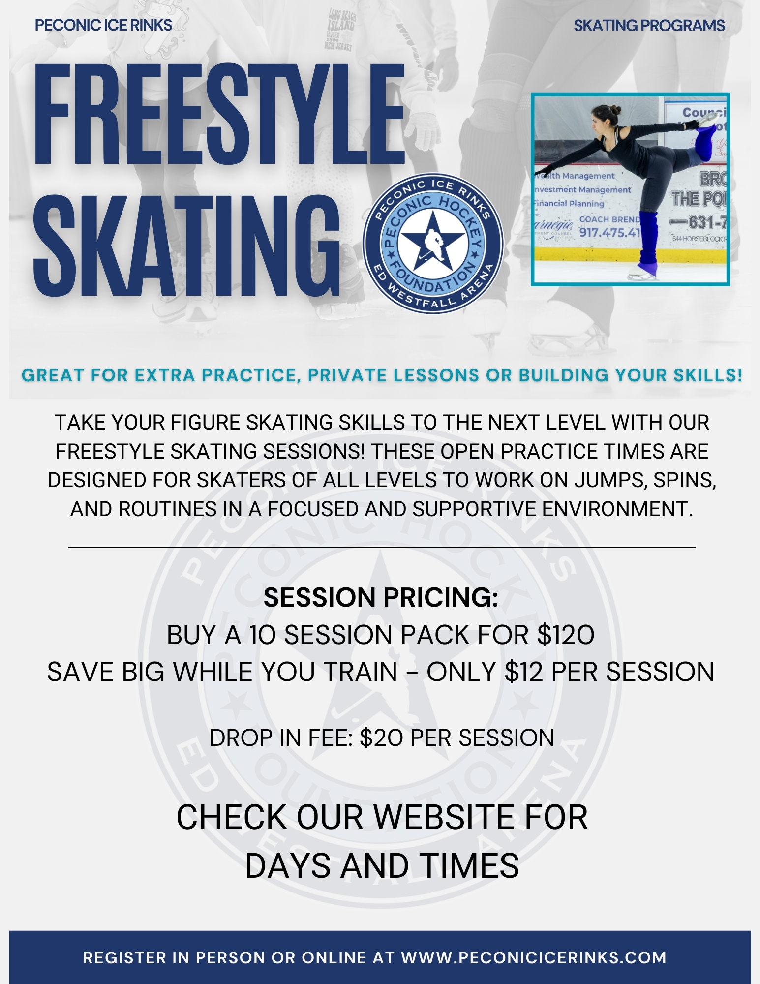Whether you're preparing for a competition or simply looking to improve, Freestyle sessions provide the perfect space to perfect your techniques and artistry. Coaches are welcome to provide instruction during these sessions. Check our schedule for available times and enhance your skating performance today!​