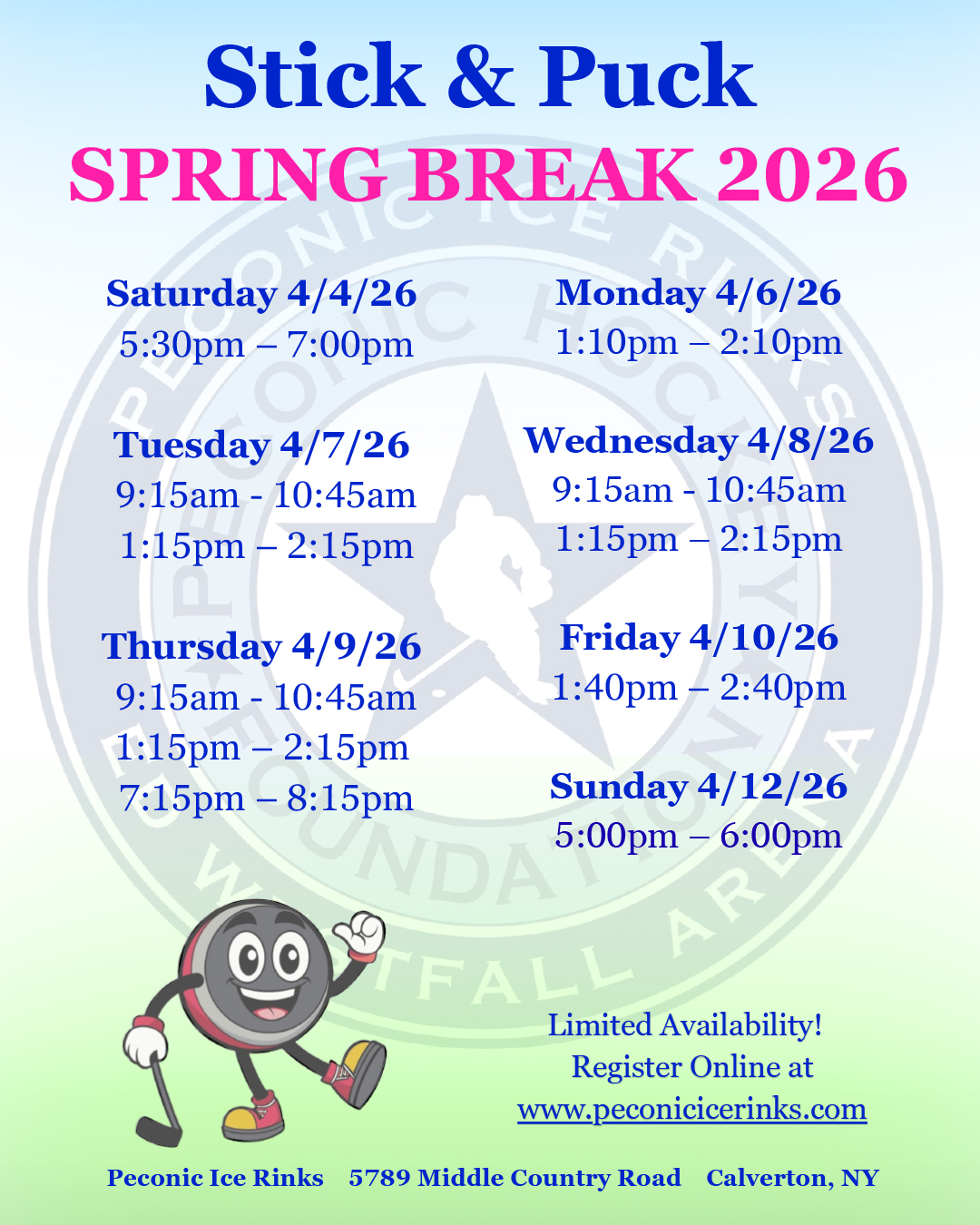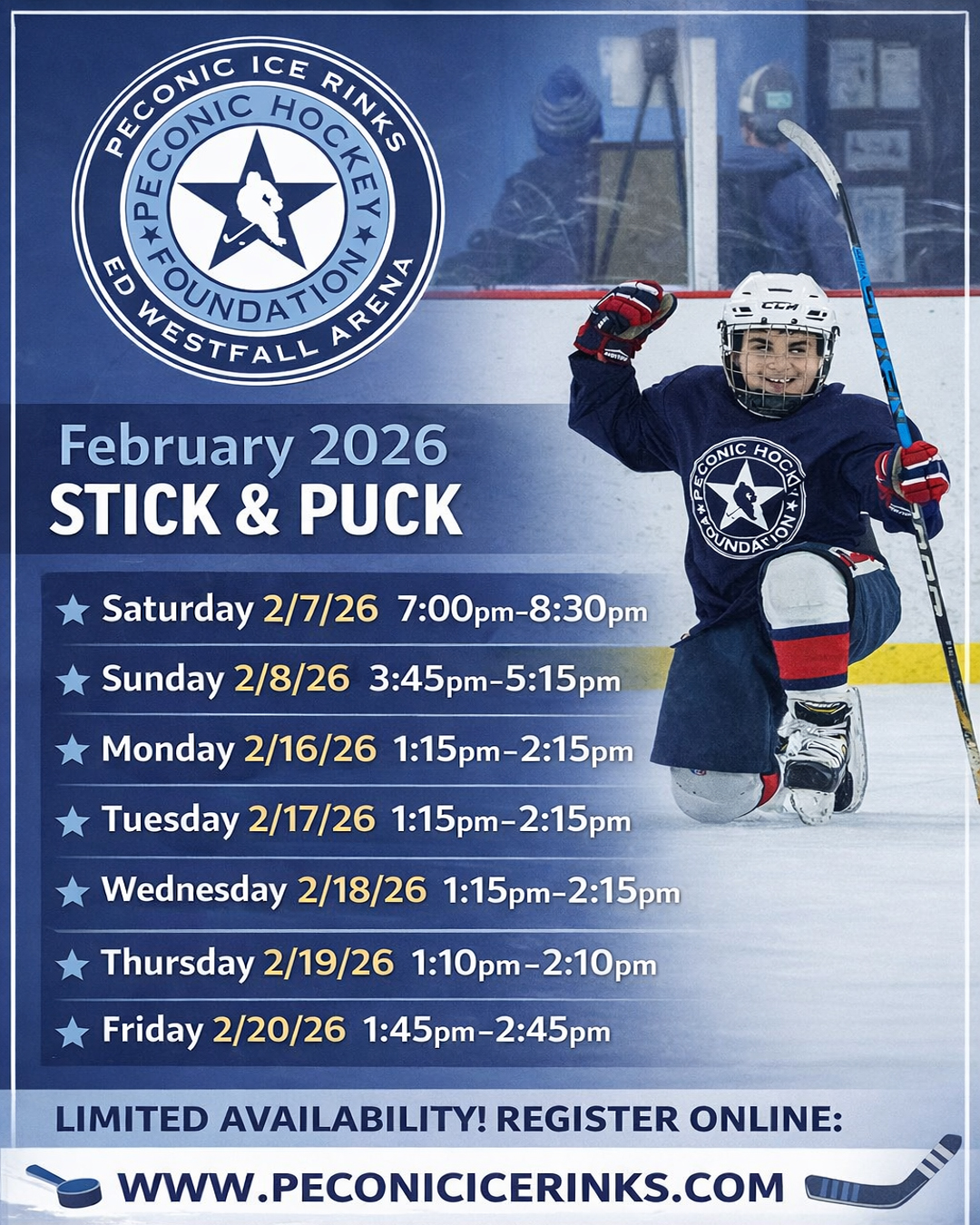Take shots on net, improve your puck-handling and skating skills, or just simply skate & shoot around and enjoy the ice at our Stick & Puck sessions!